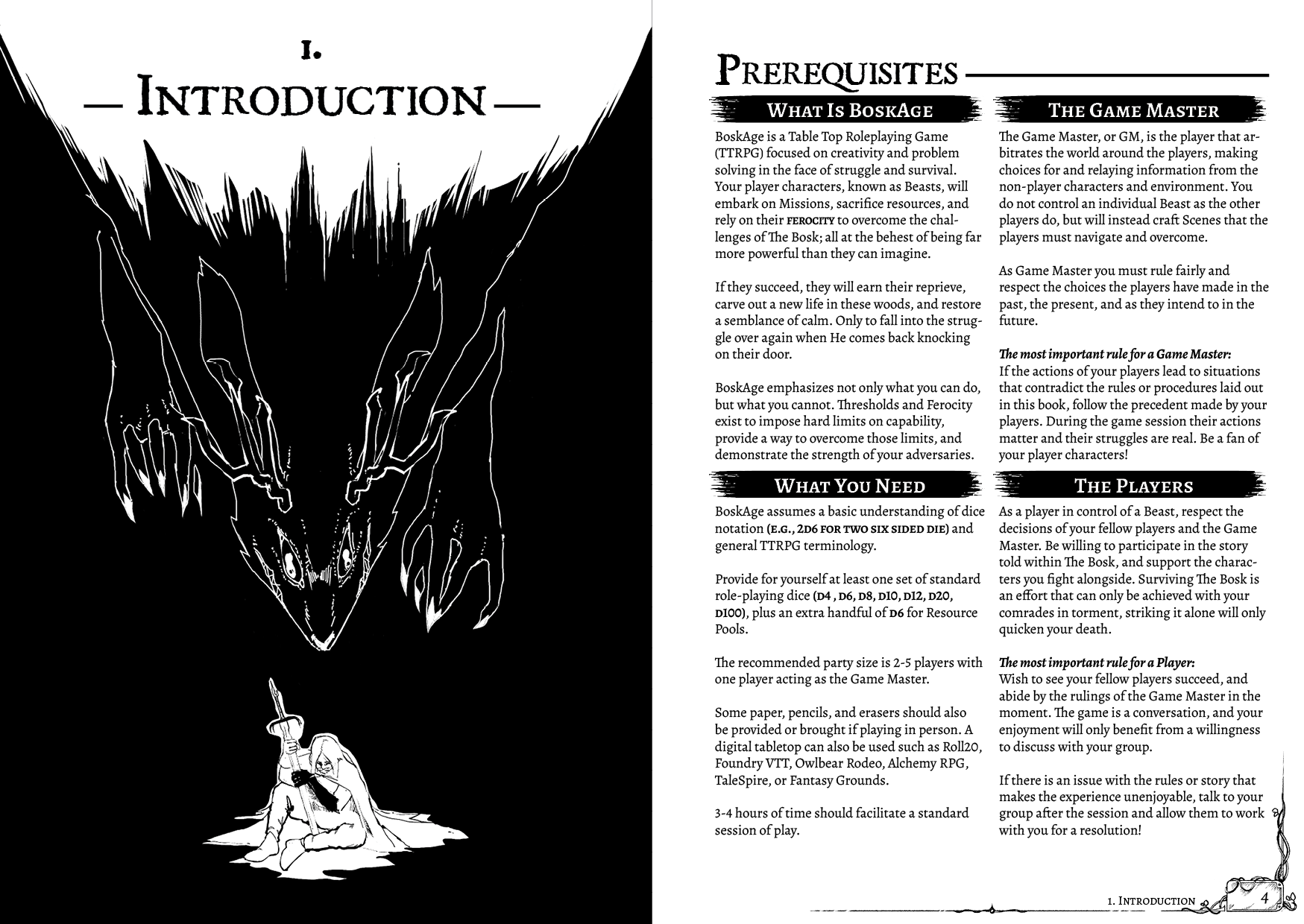 A world and ruleset written and illustrated by hand, BoskAge is entirely human made by a single artist. The Bosk itself is poorly understood, only few outside of its grasp know of its existence. Some might call it the home of faeries, others might call it Hell, while those trapped within are begrudged to accept it as home. The only thing that truly matters here is survival. Kilik-Kilik will make sure of that.